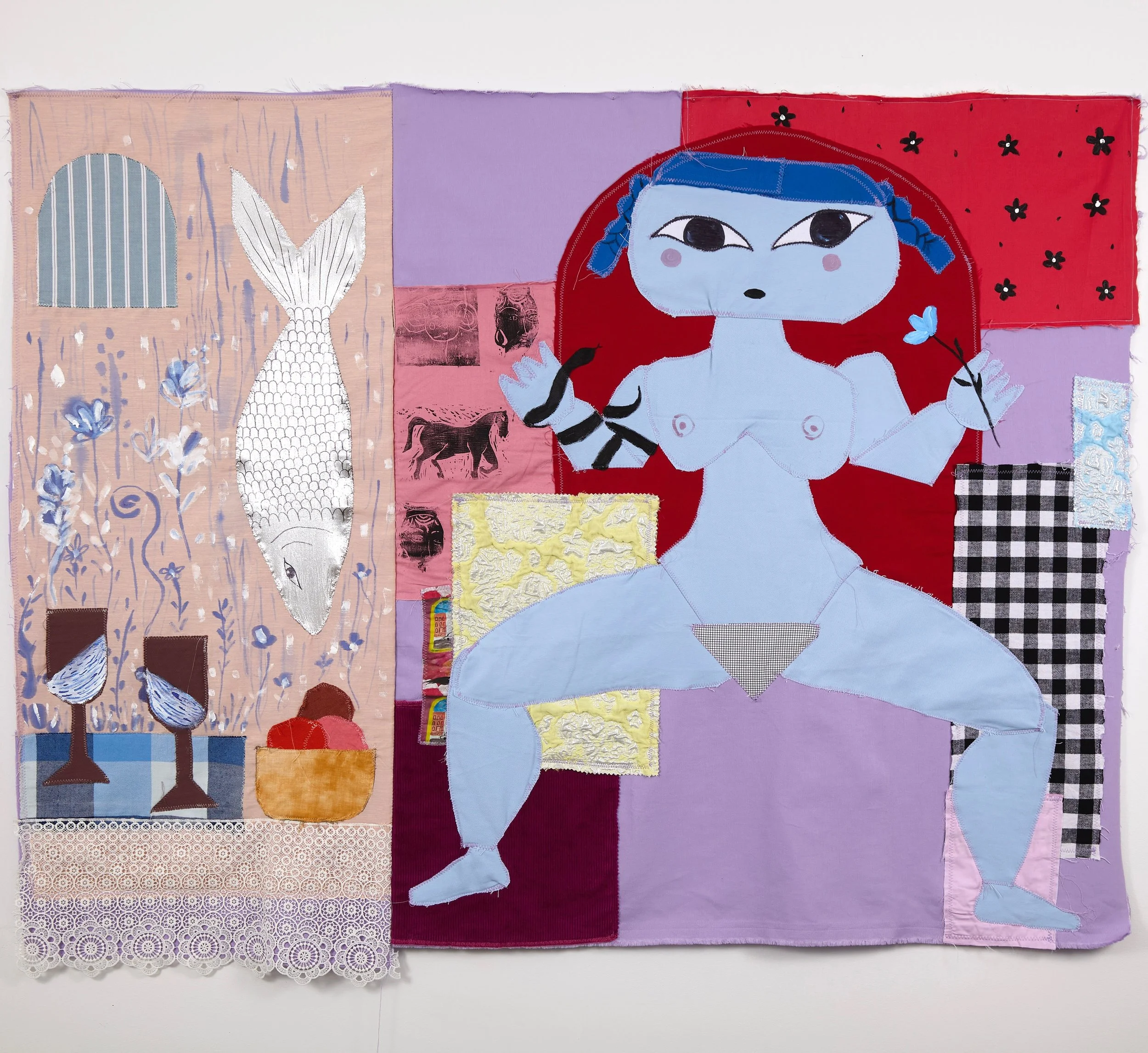 Blue Girl, 2025, Mixed textile, acrylic paint, ink, 54 x 43 inches.